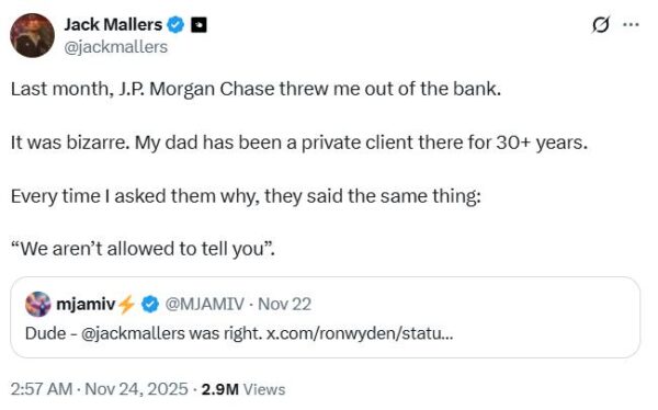 Even Jack Mallers, the CEO of Strike (a major bitcoin exchange) showed how Chase had kicked him out of the bank.