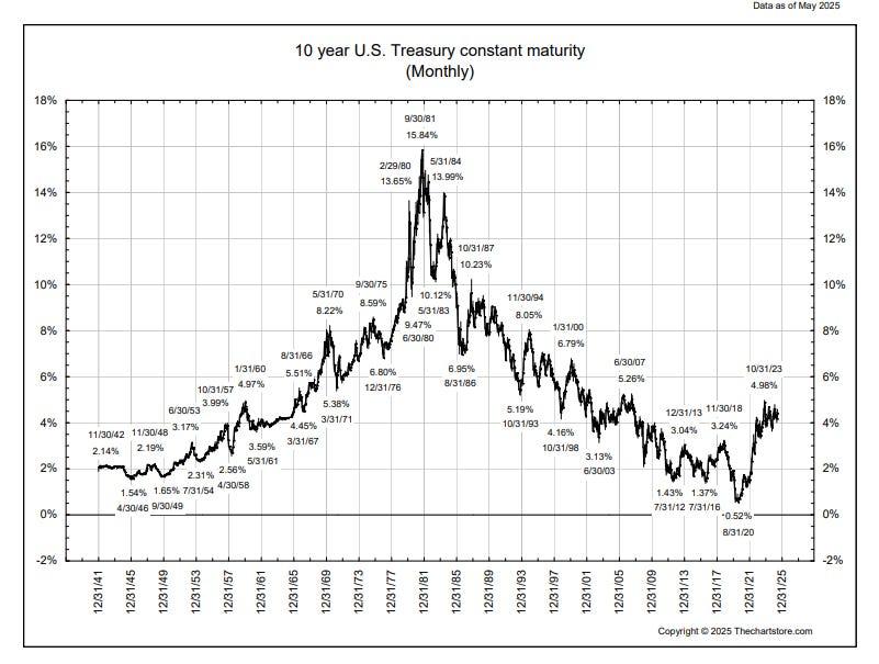 Interest rate cycles may reflect the human life cycle. Before 2020, the last low for yields came about the time we were born — after WWII. You could get a 4% mortgage in the late ‘40s. And then you had to wait about 70 years to refinance at the same rate.