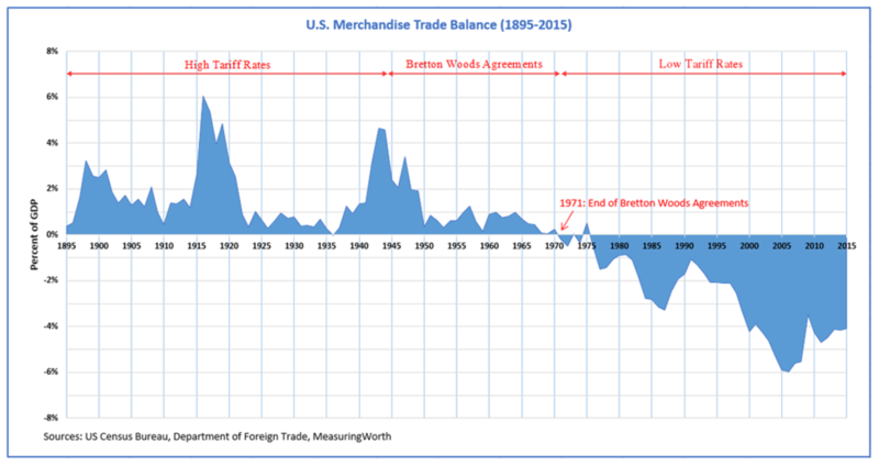 Trump wants America to enter a “new golden age”. He wants to do that by a revival of the American System. Part of that system was imposing high tariffs on imports to support manufacturing and high-paying jobs in the United States. You can see from the chart below how historically America ran trade surpluses when high tariffs were in place.