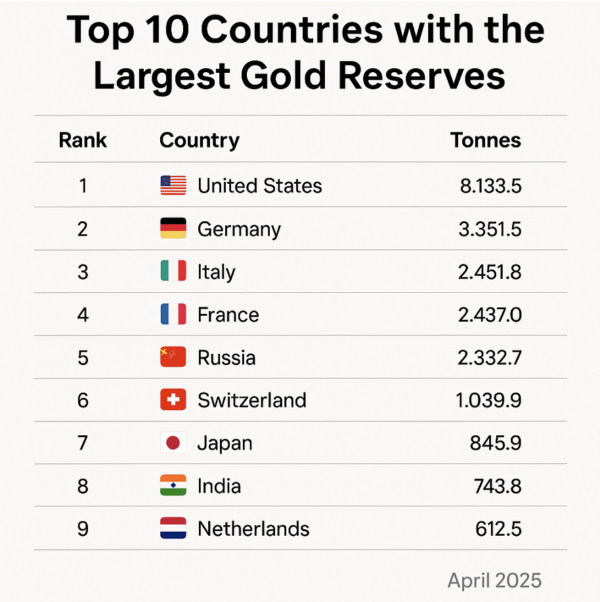 The Big Ten holders of gold include the usual suspects – the US, Germany, Italy, France, Switzerland and Japan. But the list also includes some newcomers such as Russia, China and India.