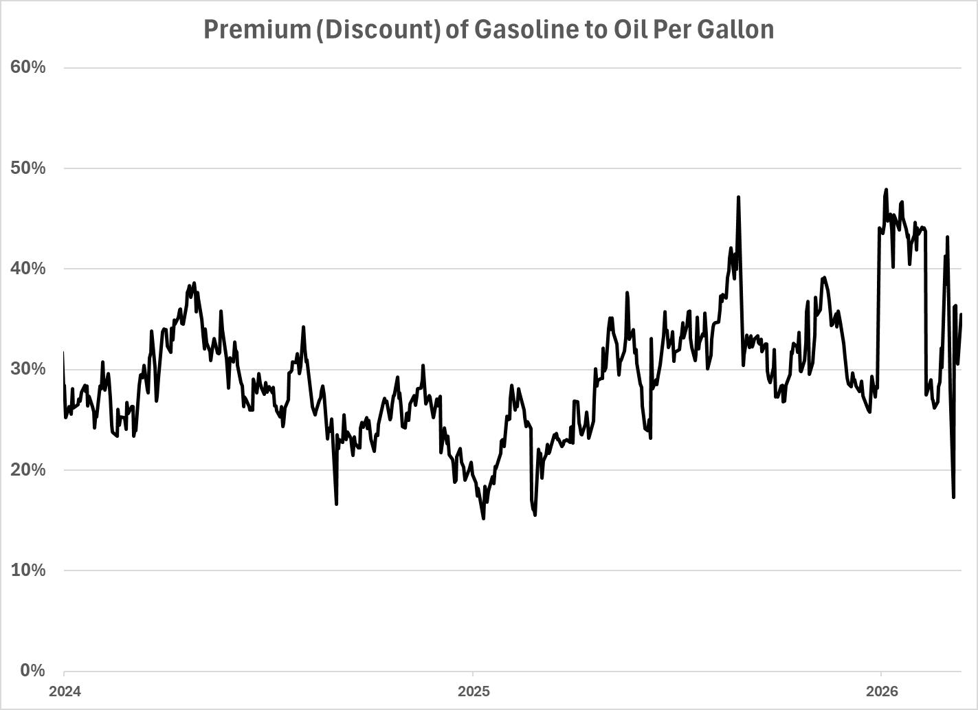 In 2022, petrol prices spiked to 122% over the price of oil. That means, if oil was $2 per gallon, petrol price was $4.44 per gallon. Since 2024, we saw it as high as 48% over the price of oil.