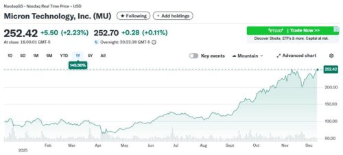 To further demonstrate the near vertical price moves of memory, just look at two of the world’s biggest memory makers, Micron (NASDAQ:MU) and SK Hynix (KOR:000660) over the past year.