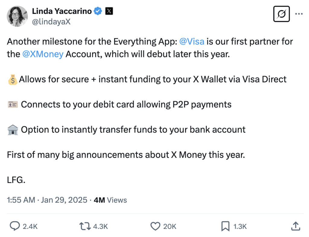 This “everything app” idea has been supported by X.com CEO Linda Yaccarino. Notably at the end of January, she posted a big update on that progress when she announced Visa as a partner for the X Money account debuting later this year.